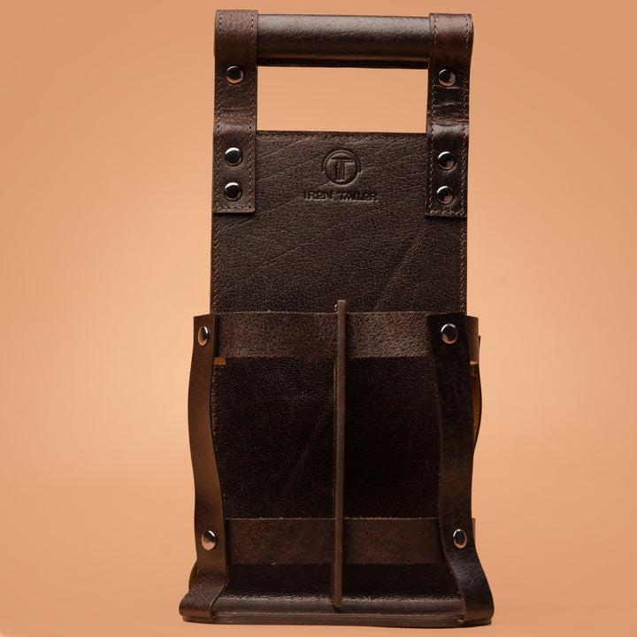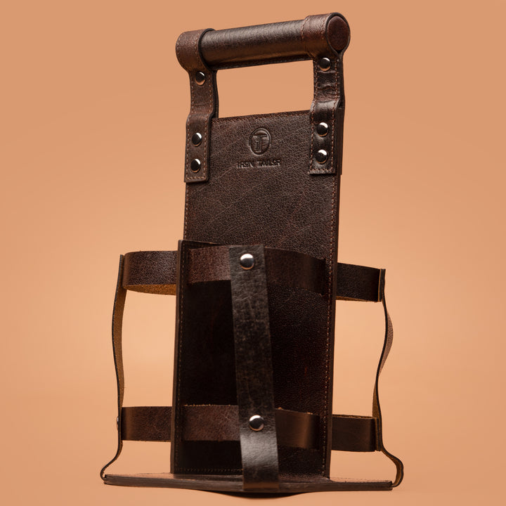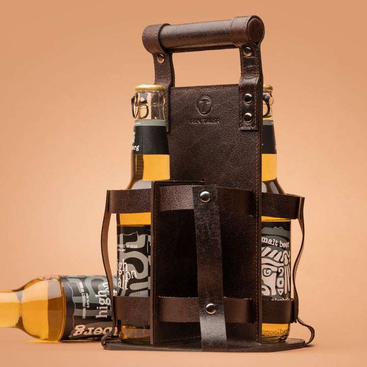 Design: Six-slot carrier with reinforced seams and riveted leather straps for secure grip and lasting durability
