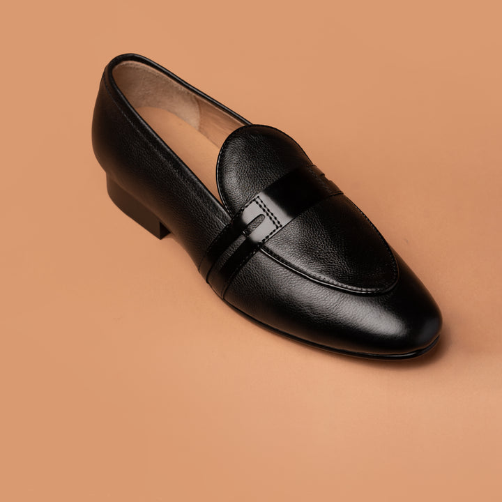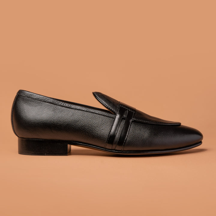 Premium Black Leather Product: Crafted from high-quality genuine leather product, these loafers boast a beautiful, subtle grained texture on the body, offering depth and character, complemented by a smooth or polished strap (the "tie").