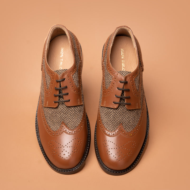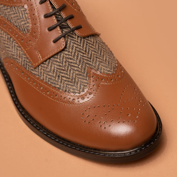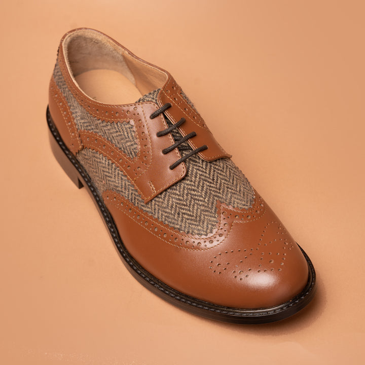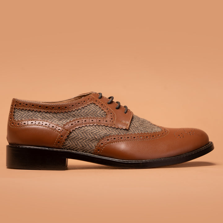 Two-Tone Design: Rich tan leather meets a distinctive herringbone wool textile for eye-catching texture.