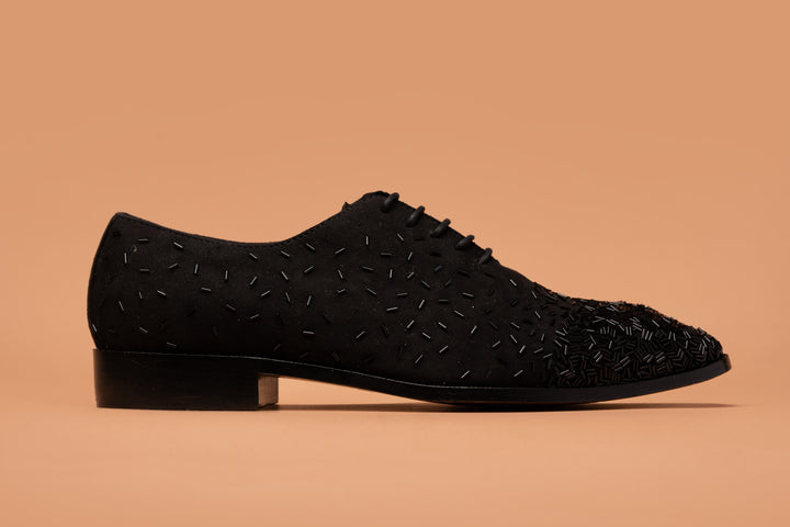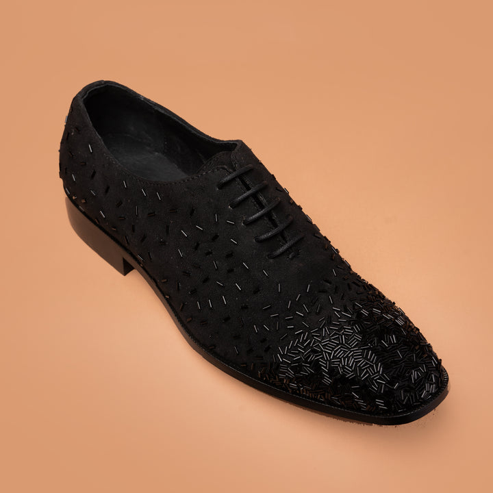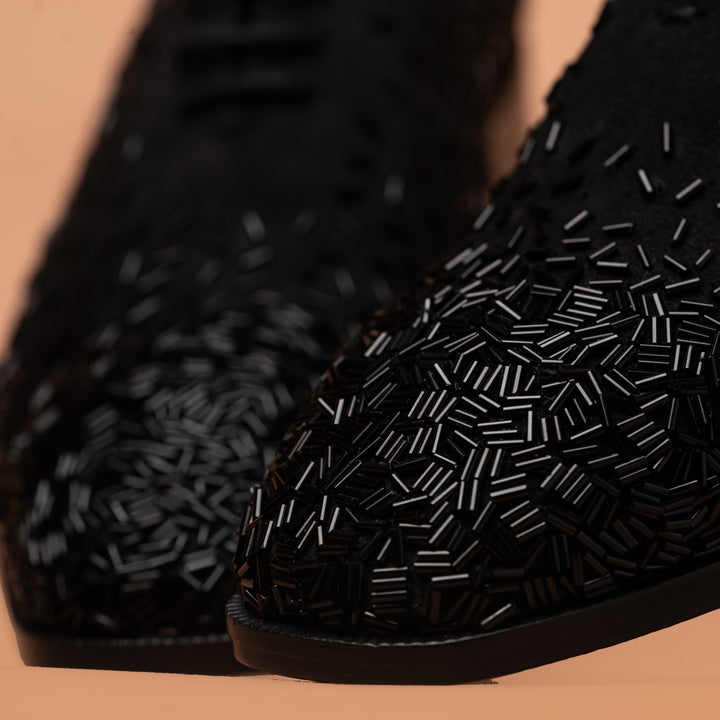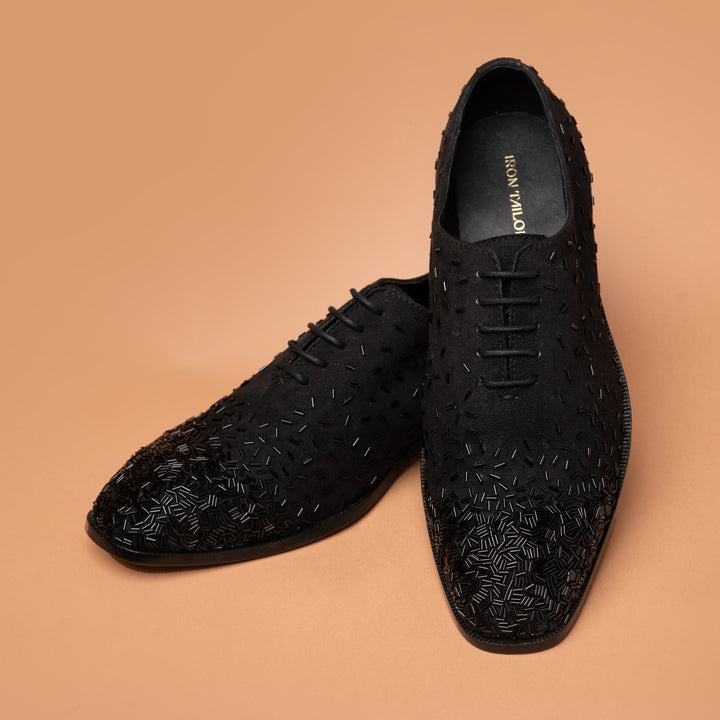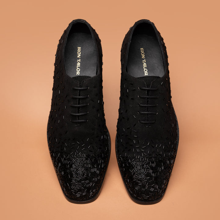 Introducing the Iron Tailor "Crystel Black" Lace-Up. A dramatic black leather product shoe featuring intricate bead/crystal embellishment on the toe and heel. High-impact formal footwear with superior craftsmanship