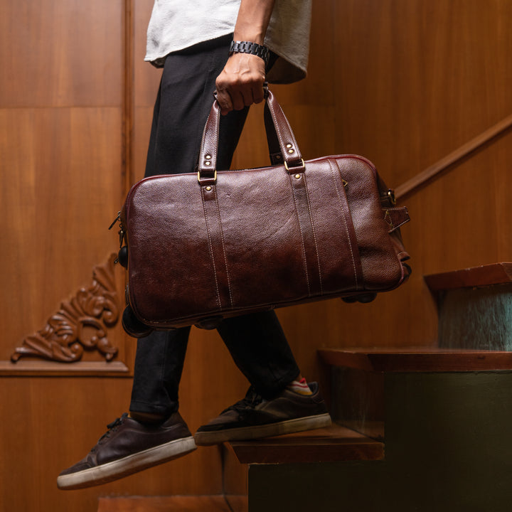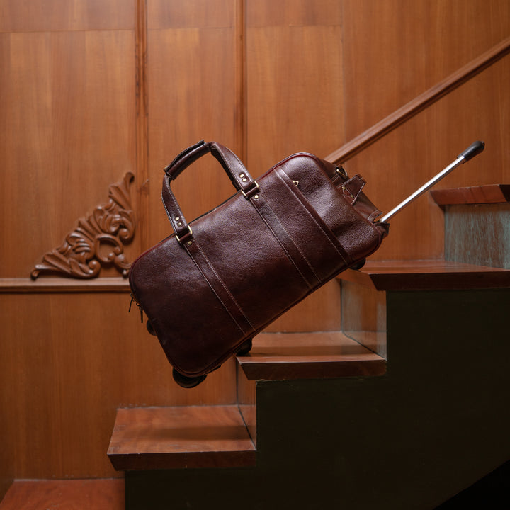 Engineered for the discerning traveler, the IRON TAILOR Leather Trolley Bag brings together old-world leatherwork and modern functionality. Its sleek, deep mahogany finish paired with reinforced detailing and silent rolling wheels makes it the ultimate statement of style and convenience.