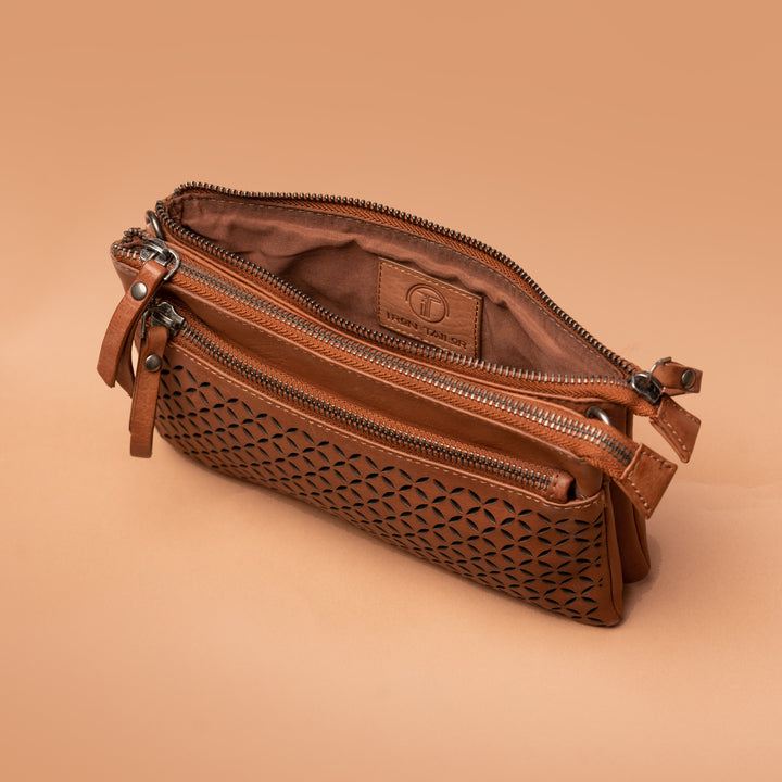 Closure : Designed as double pouch crossbody bag , with detachable 5 feet Strap same long as measurement tape, having 2 side chains well crafted genuine leather.